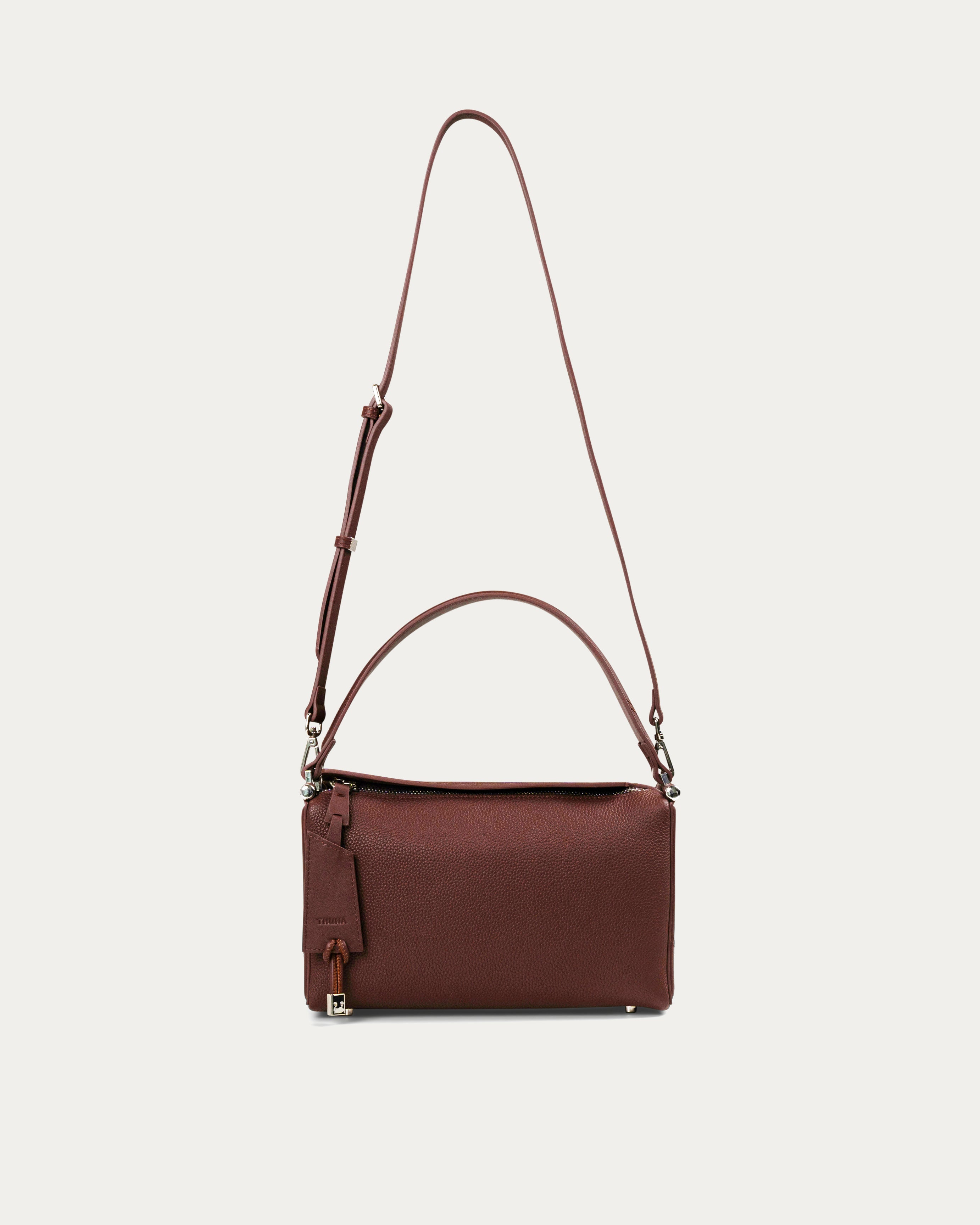 The Isla Bordeaux Handbag combines elegant design with durability, crafted from rich pebbled leather that ensures longevity. Its soft leather construction gives it a relaxed silhouette, while its box-like structure offers ample space, making it an excellent fit for all your essentials. The bag features a comfortable shoulder strap for easy wear, and the deep bordeaux hue adds a touch of warmth and sophistication to any outfit. With its timeless appeal and practical design, this bag is ideal for those seeking both style and functionality in one.